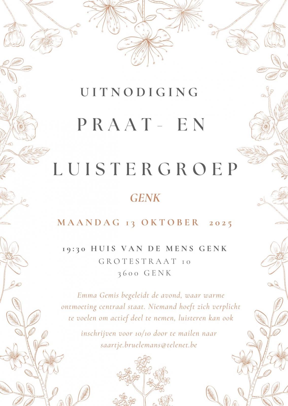 Wij nodigen jullie graag uit op de praat- en luistergroep in Genk. Deze ontmoeting gaat door bij Huis van de Mens te Genk.